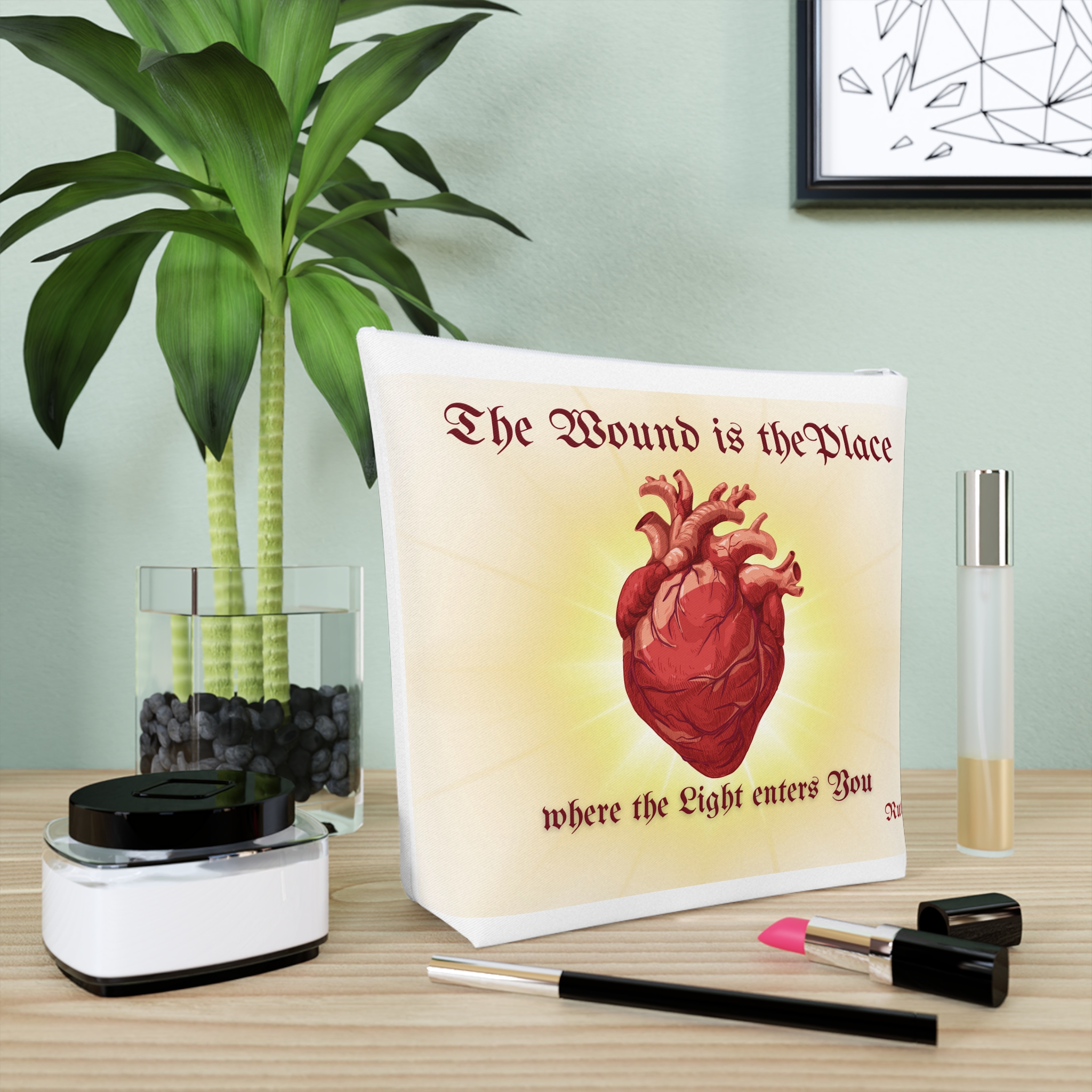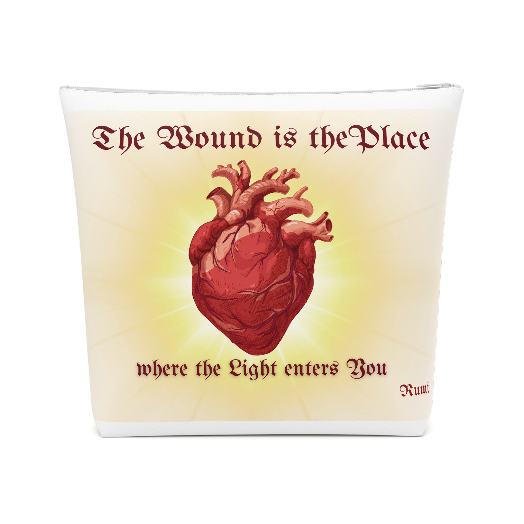 Astuccio porta make-up in drill di cotone 100%. Realizzata al 100% in cotone drill, questa pochette non solo è bella, ecologica e ispirazionale, ma può anche resistere ai viaggi costanti e all’uso quotidiano. Rumi – “The Wound is the place where the light enters you”