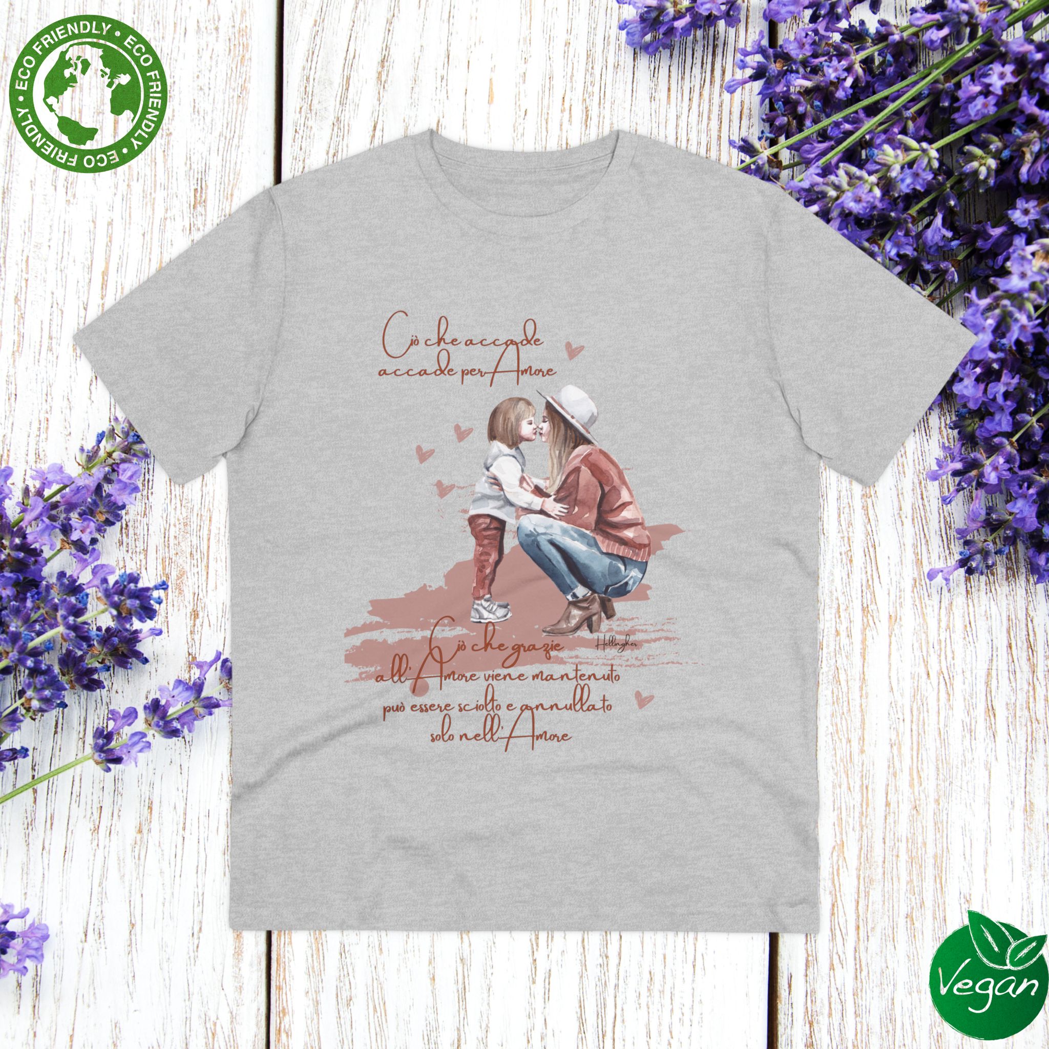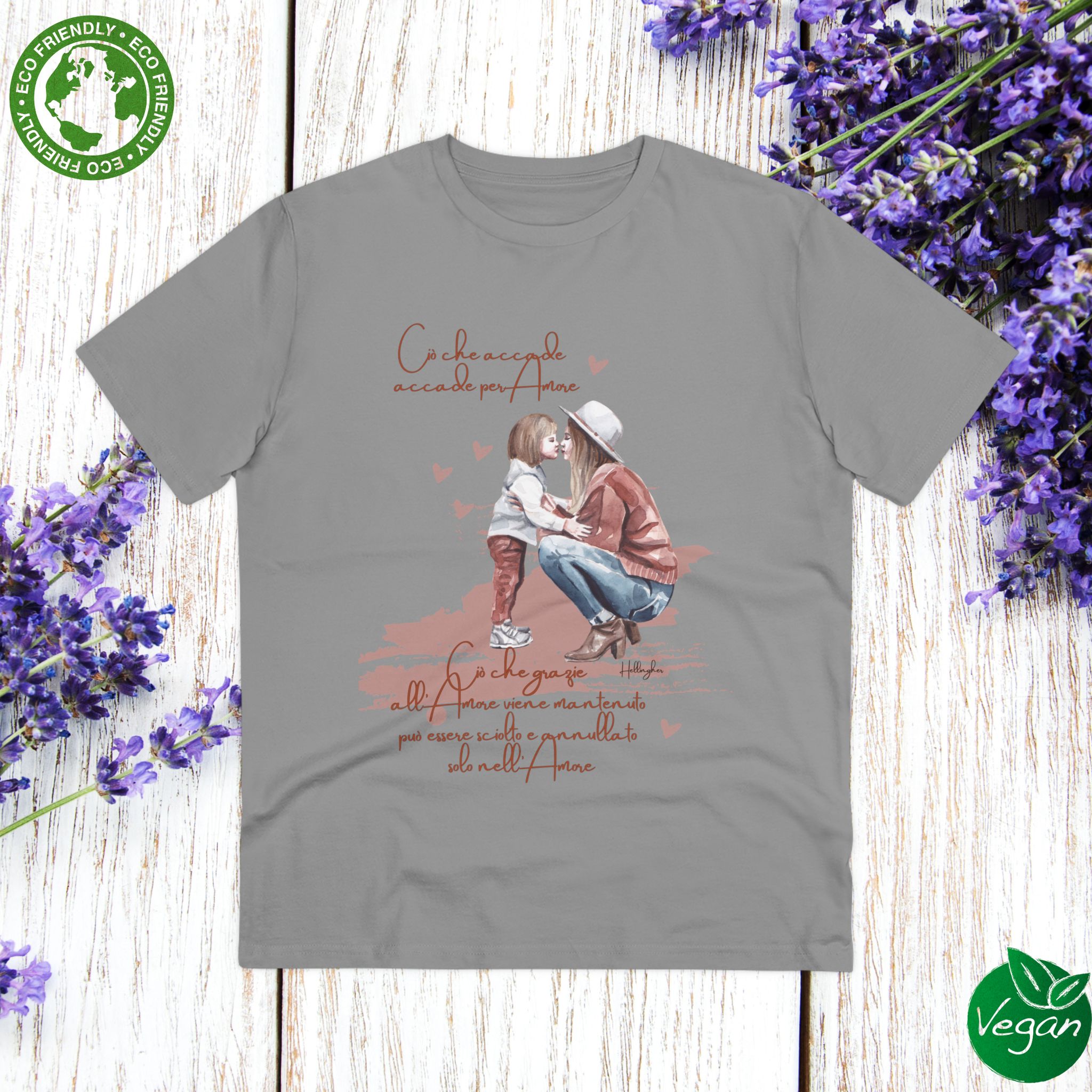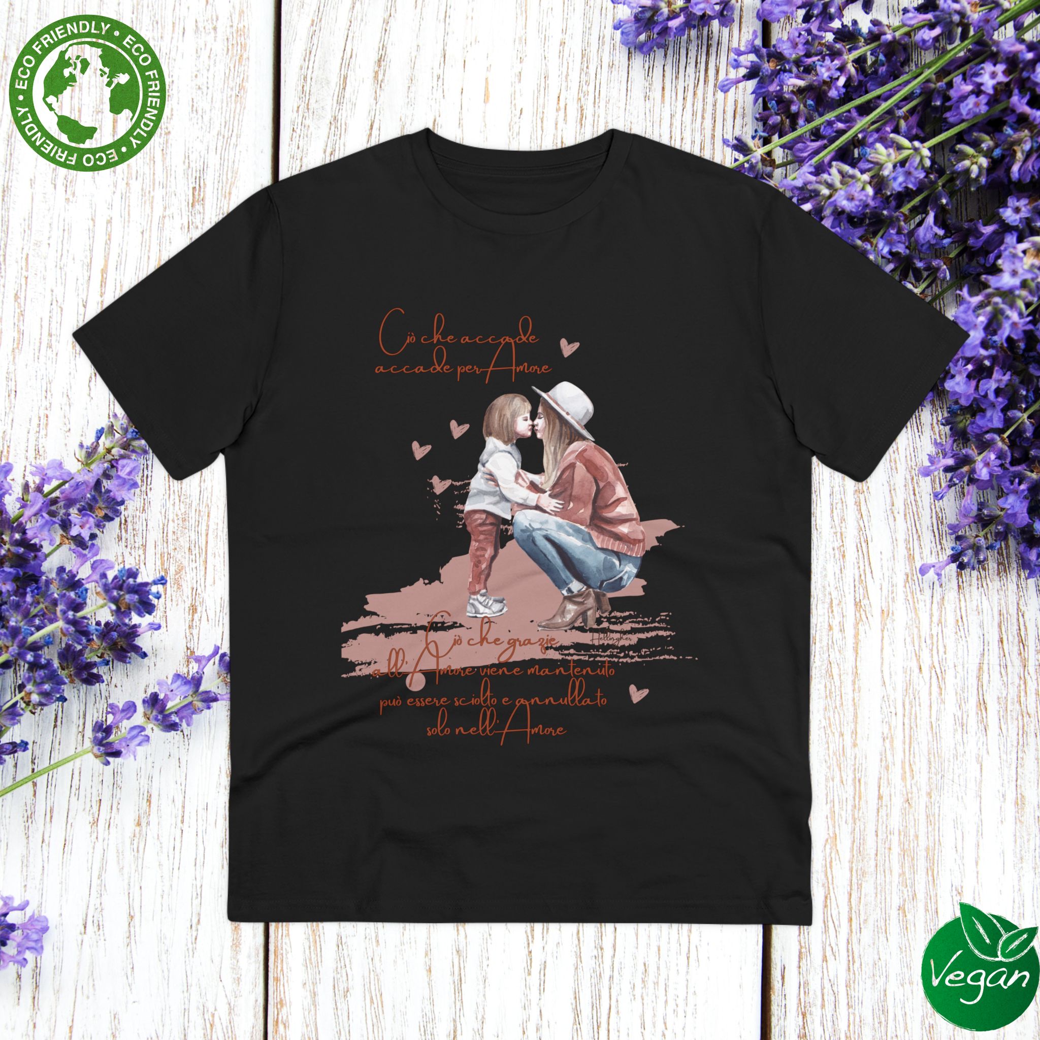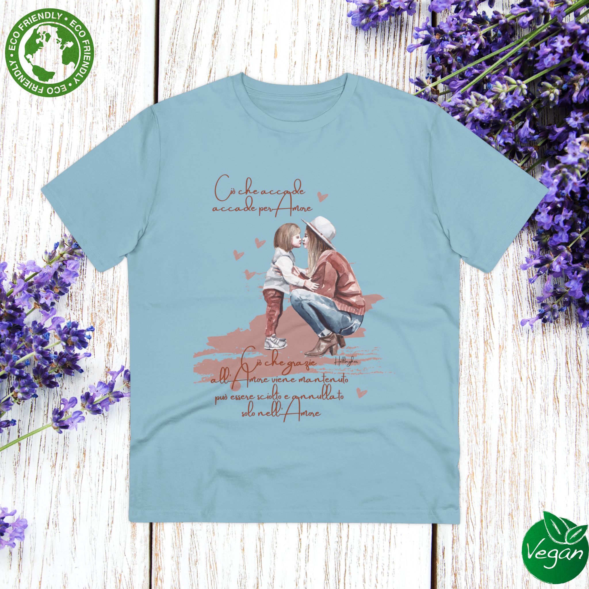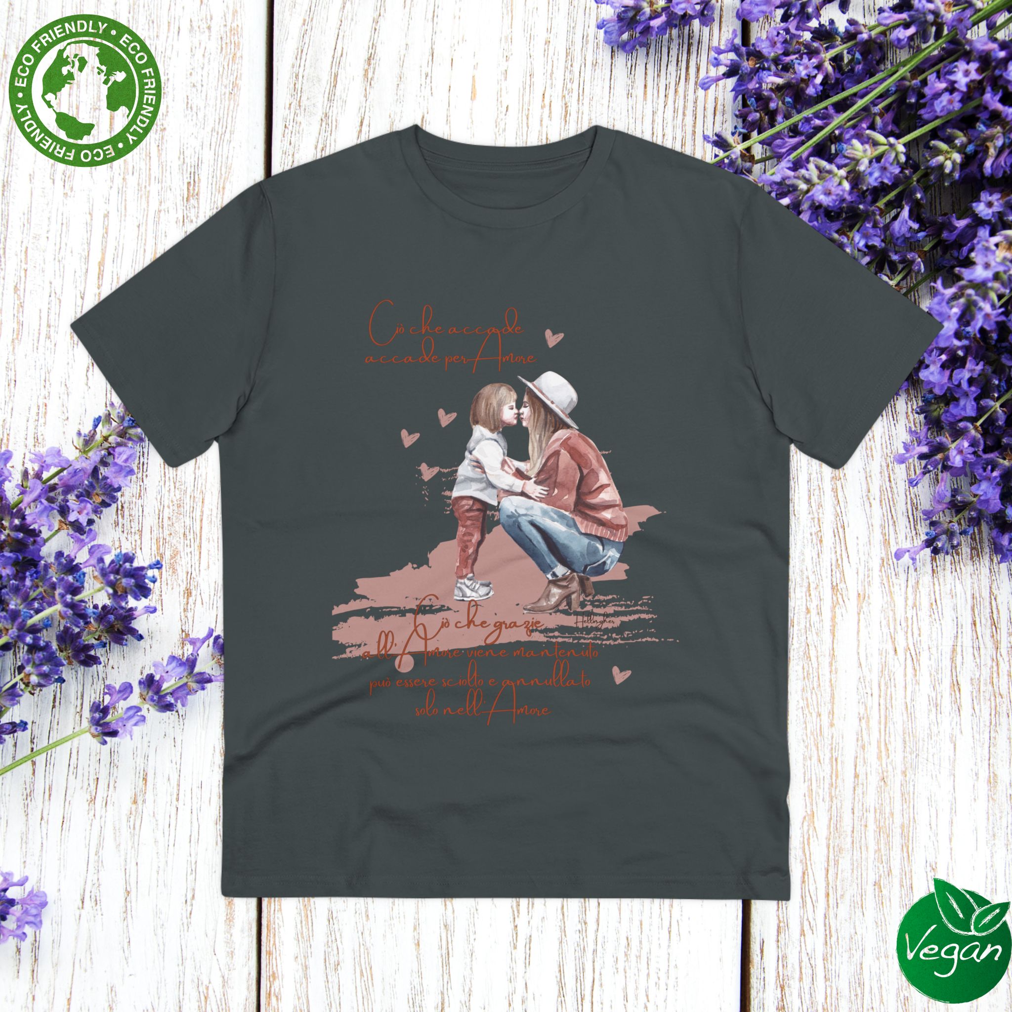 100%cotone, organico,vegan. “Ciò che accade, accade per amore. Ciò che grazie all’amore viene mantenuto può essere sciolto e annullato solo nell’Amore” ispirata alle Costellazioni Familiari di Hellinger.